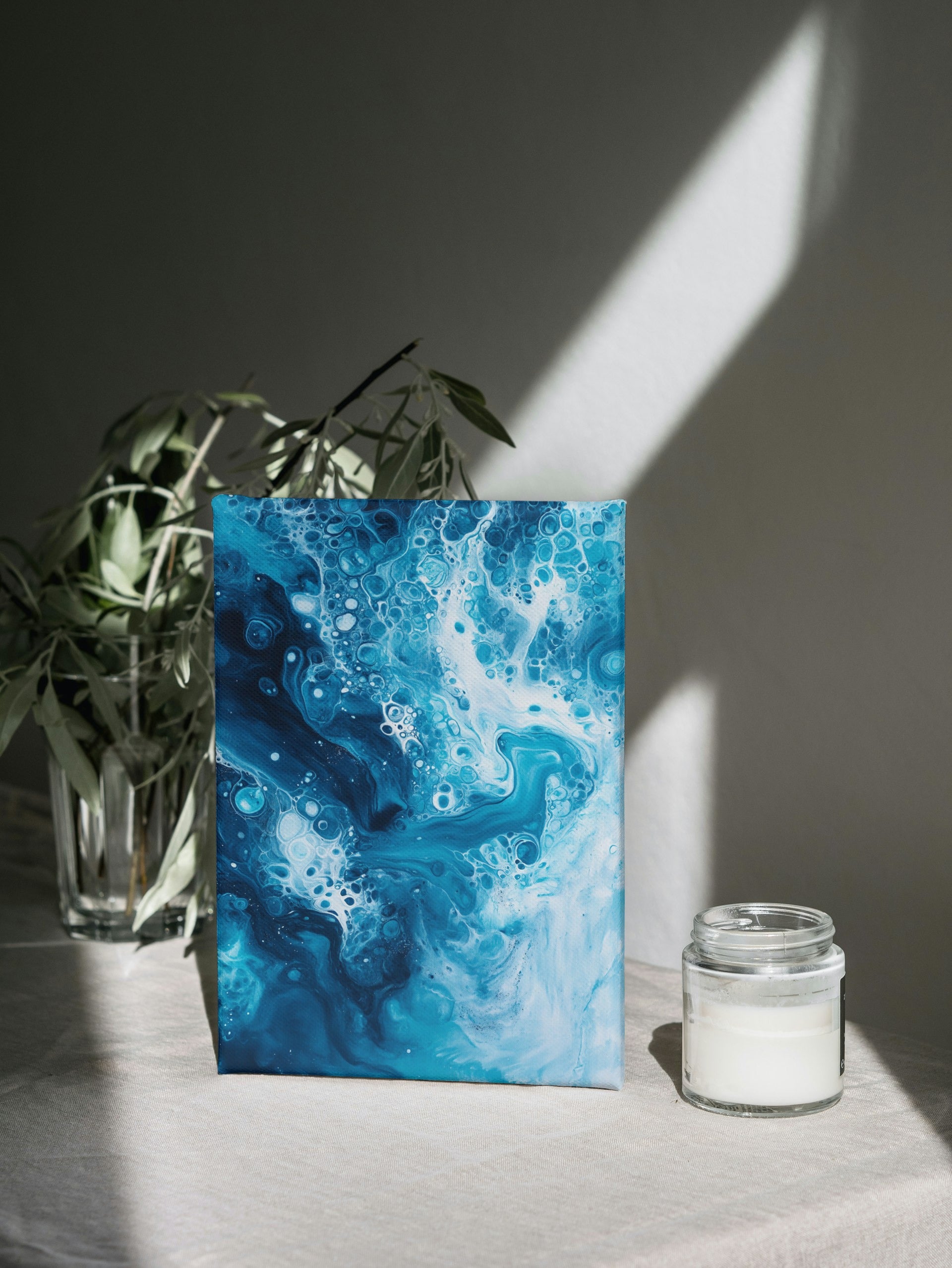 Ob für dein Wohnzimmer, Schlafzimmer oder deine persönliche Meditations-Ecke – "Blue Ocean Abstract" fügt sich nahtlos in jede Umgebung ein und unterstützt dich dabei, einen Ort der Ruhe und Balance zu erschaffen.