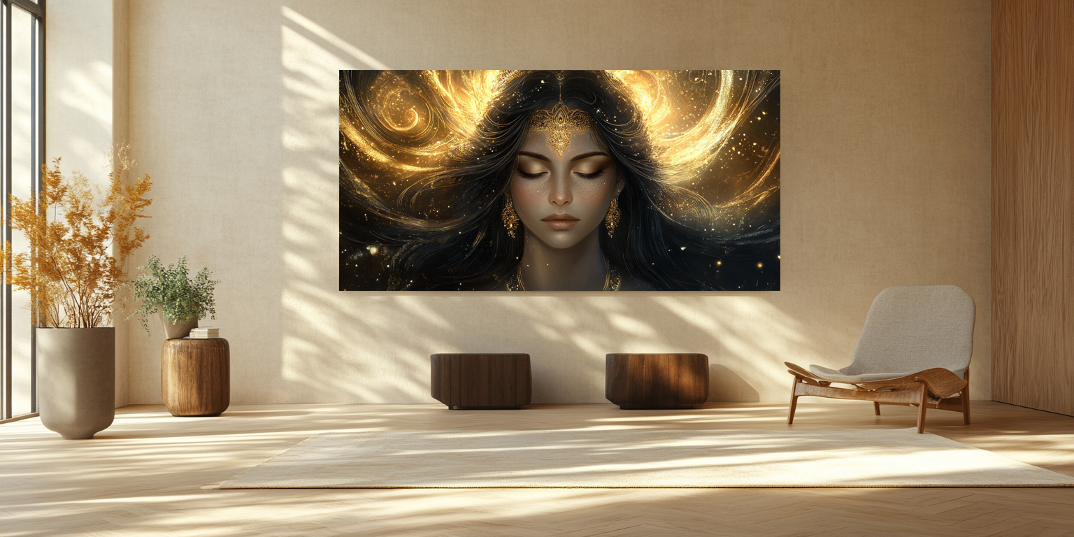 Ob für dein Wohnzimmer, Schlafzimmer oder deine persönliche Meditations-Ecke – "Golden Goddess" fügt sich nahtlos in jede Umgebung ein und unterstützt dich dabei, einen Ort der Ruhe und Balance zu erschaffen.