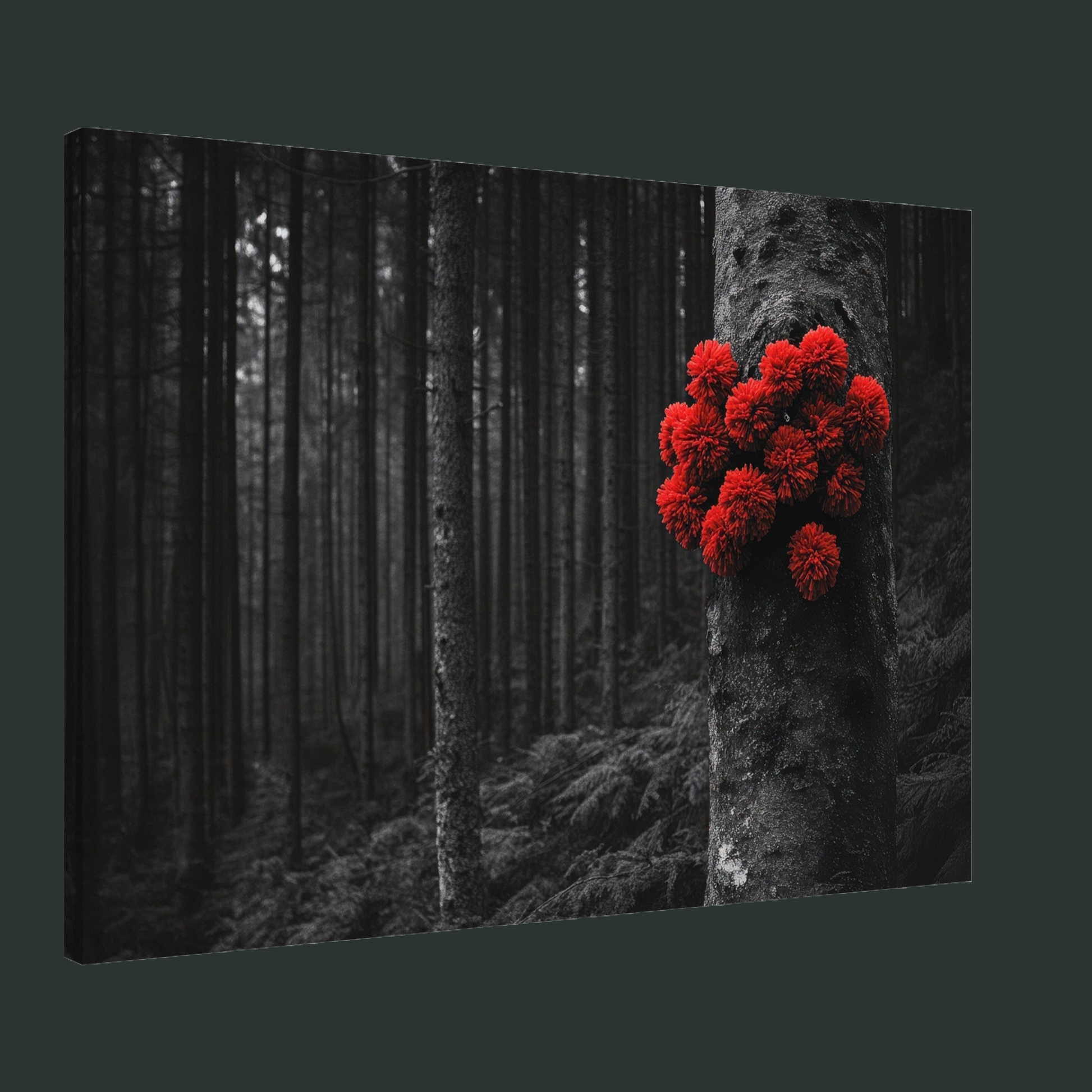 Die 2 cm dicke Galerie-Bespannung verleiht "Scarlet Blooms in the Forest" eine beeindruckende Tiefe und macht es zum perfekten Begleiter für deine Meditationsmomente.
